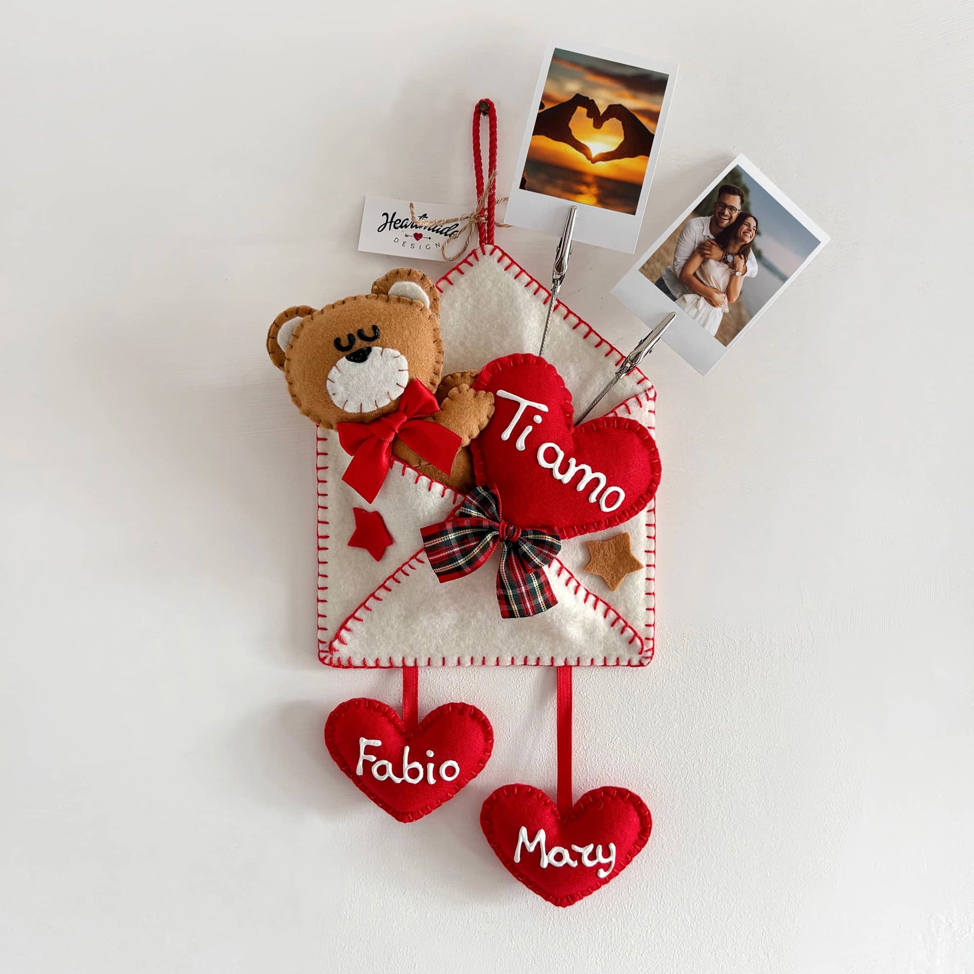 Una tenera busta da lettera con un orsetto che porta un messaggio d'amore. Regalo perfetto per San Valentino o per un anniversario. Un'alternativa unica e originale al solito porta fotografie. Scegli i nomi da inserire nei cuoricini.