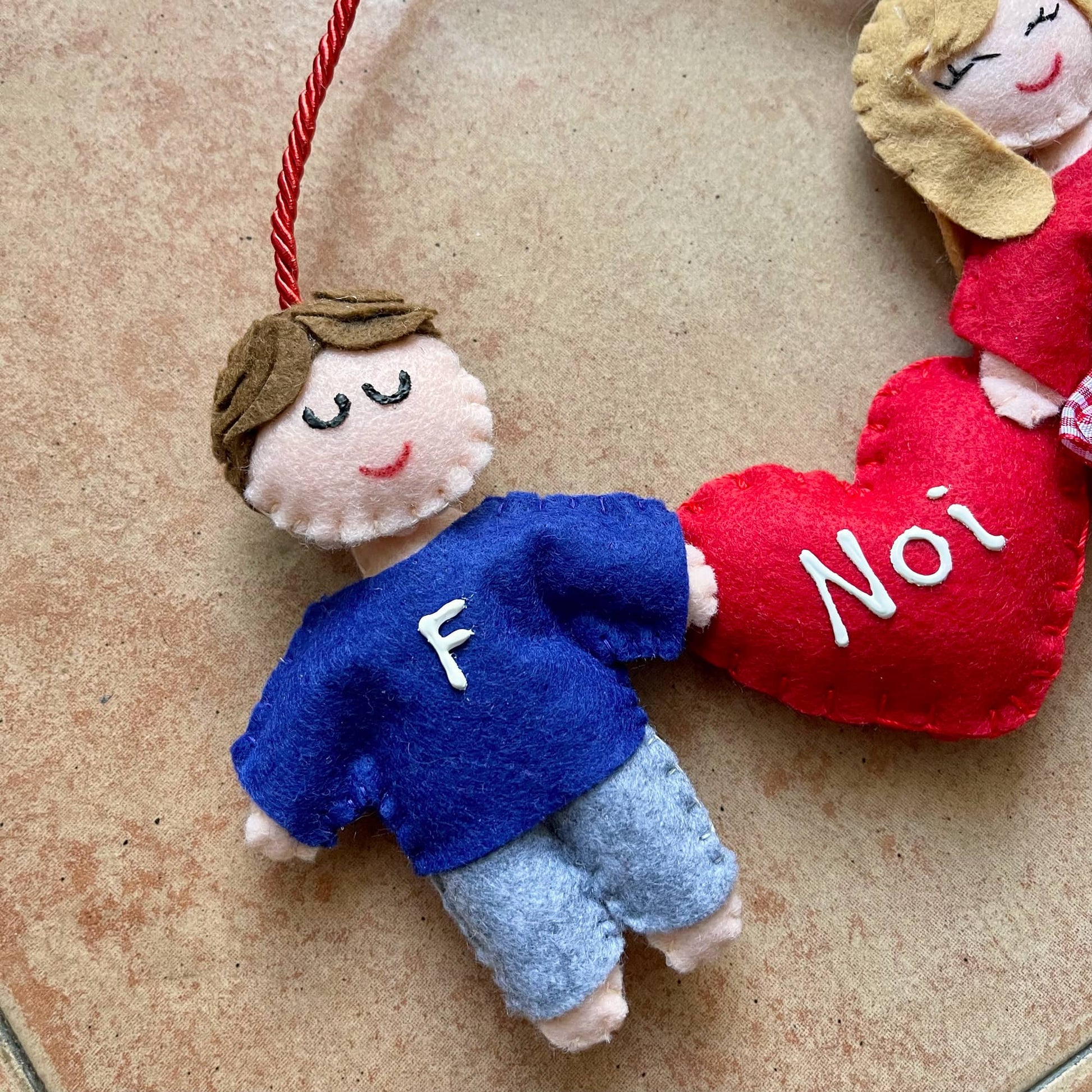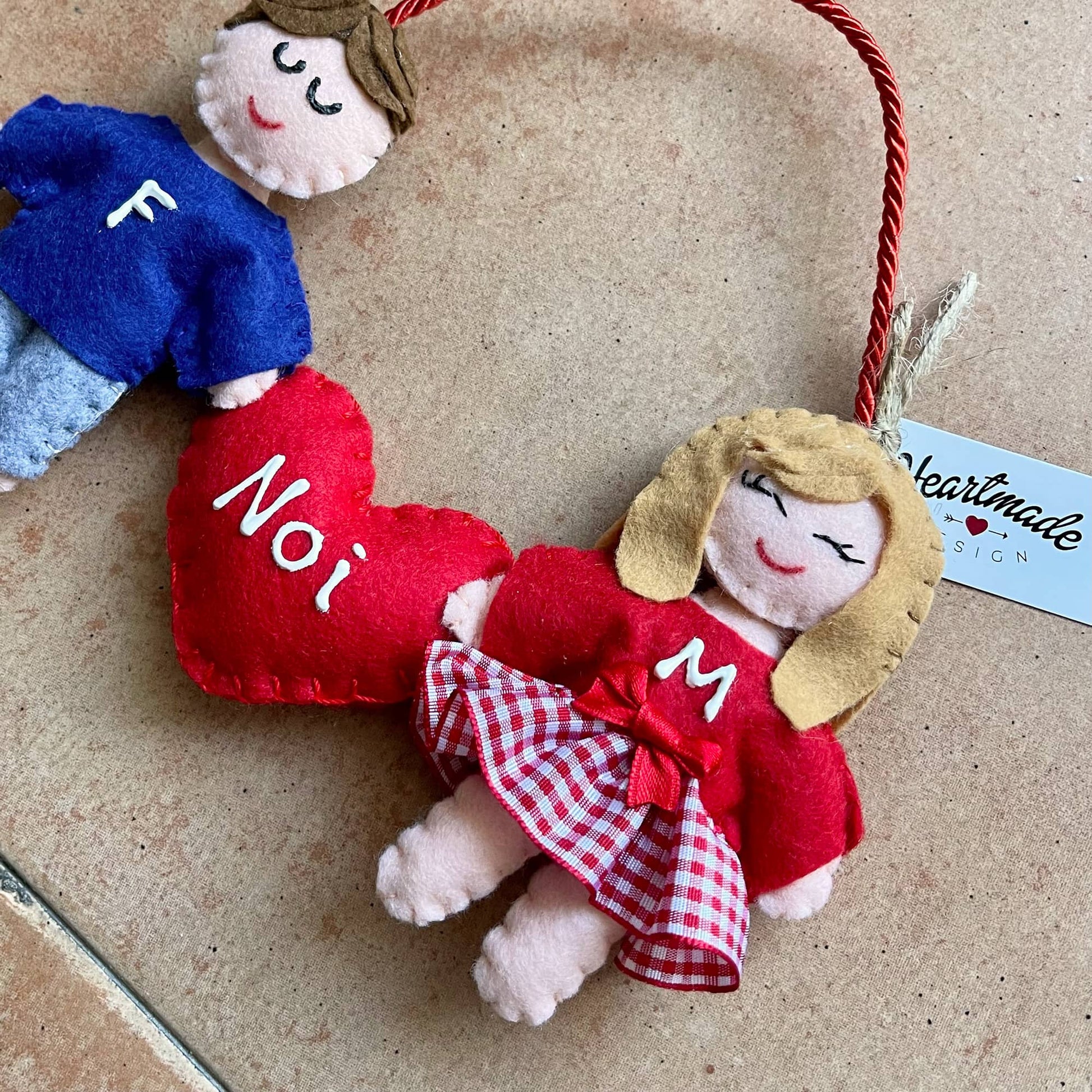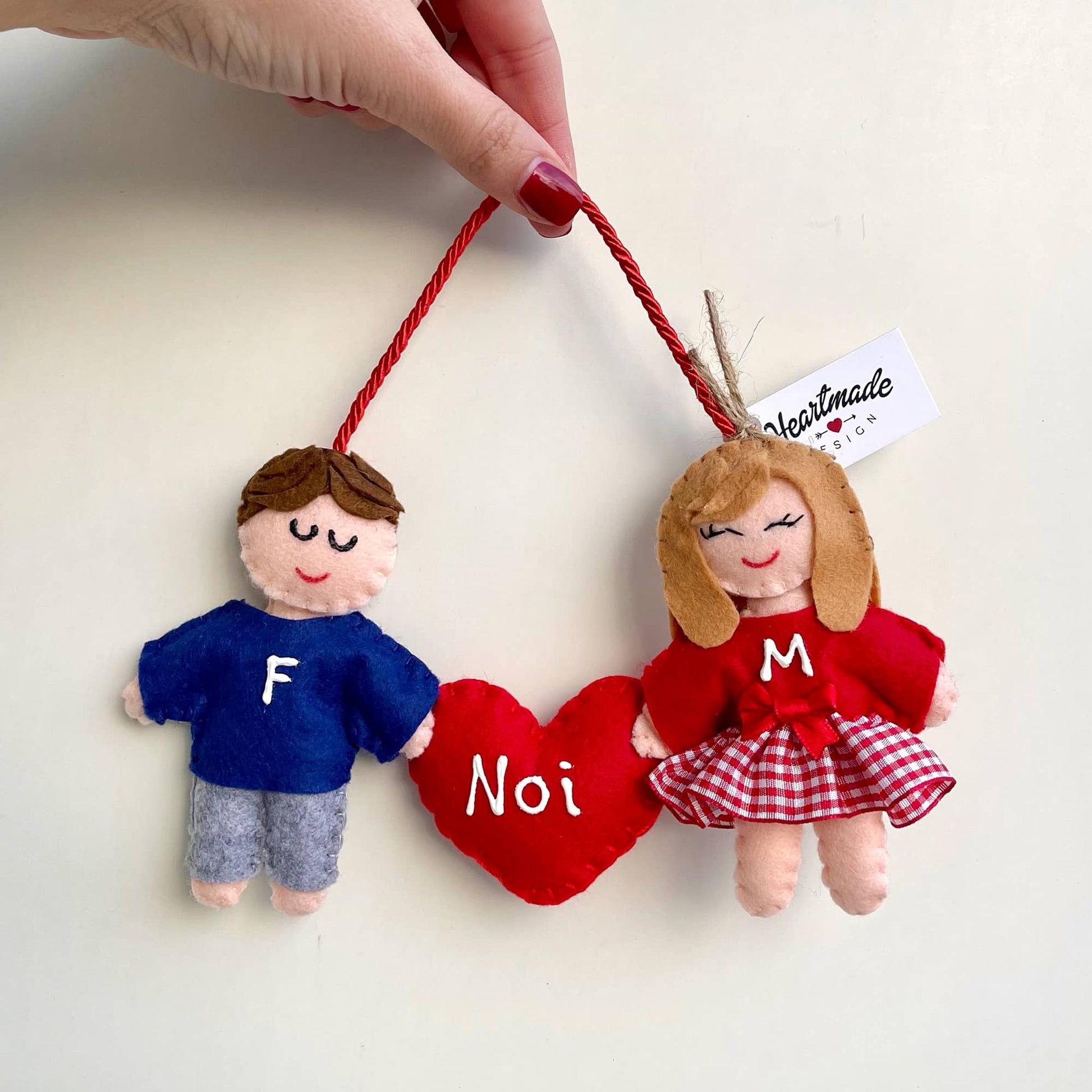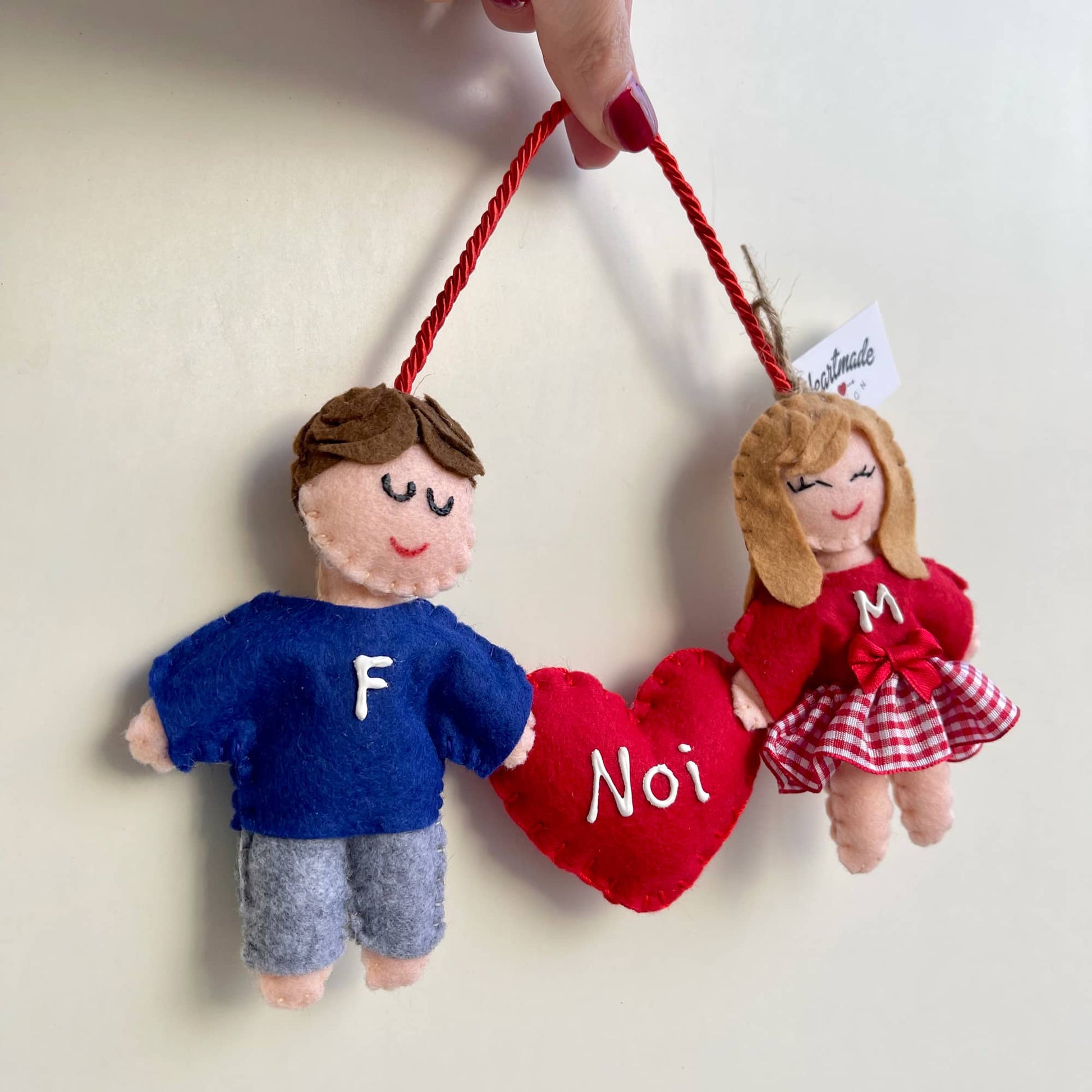 Tenera coppietta con cuoricino. Personalizza i pupazzetti scegliendo il colore dei capelli e le iniziali. Puoi scegliere anche la dedica da scrivere sul cuoricino rispettando il limite massimo di 8 caratteri. Altezza omini: 10cm.