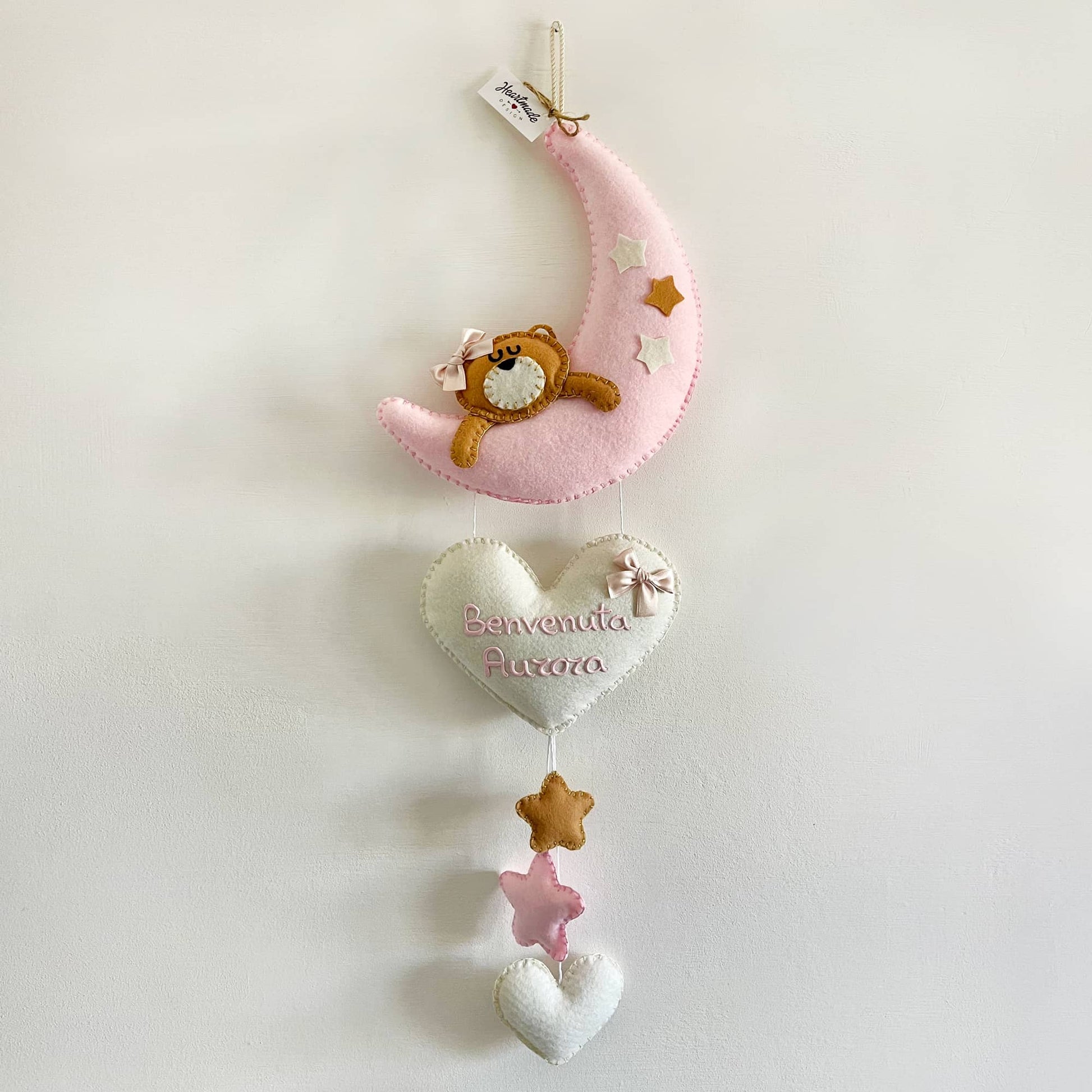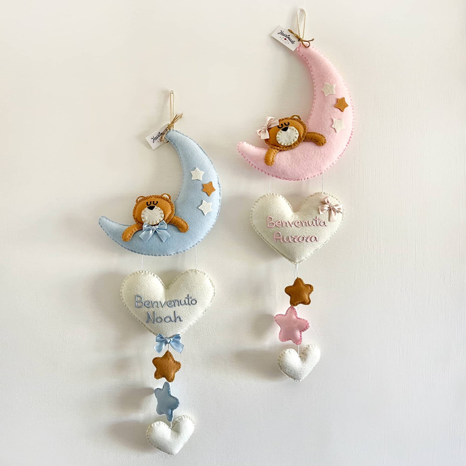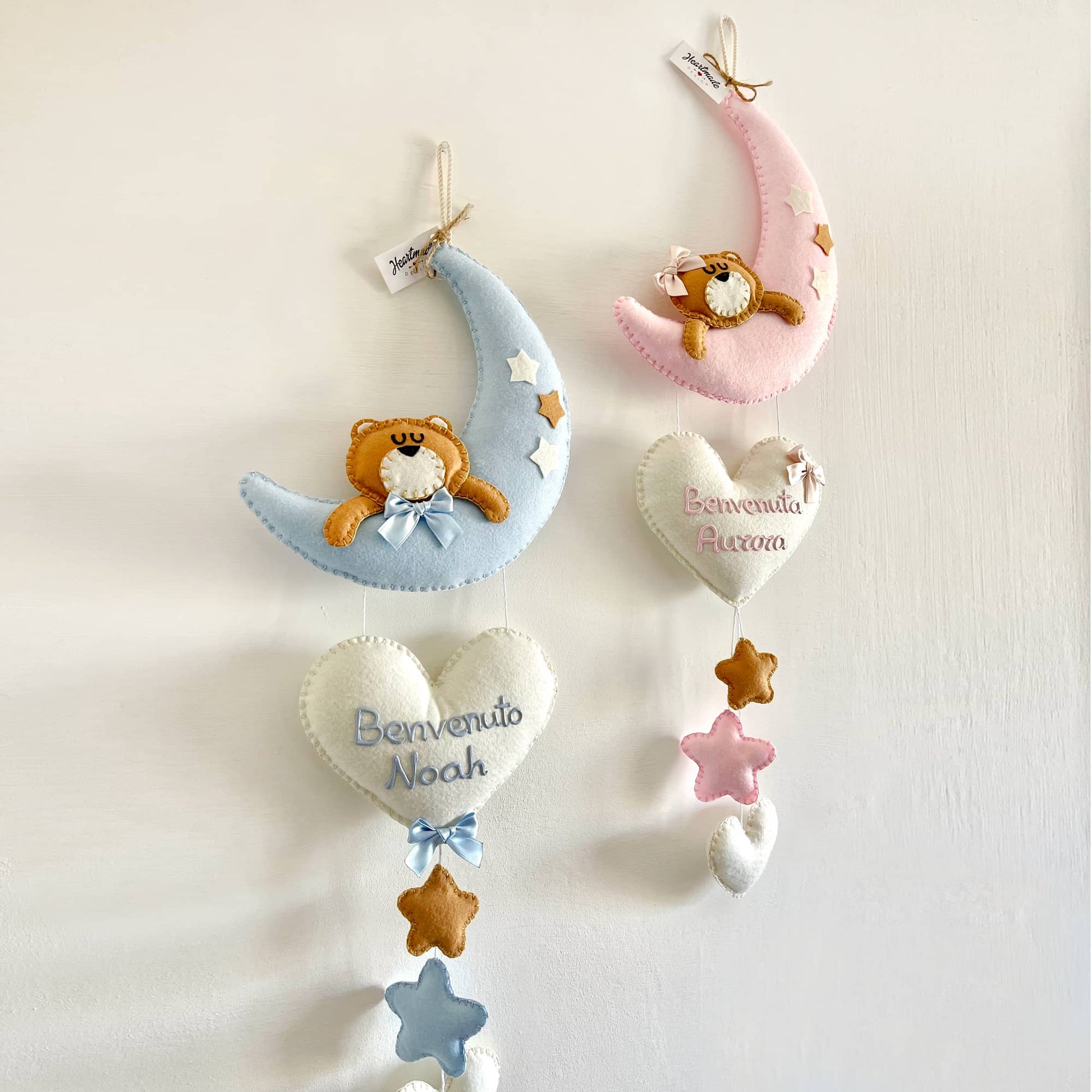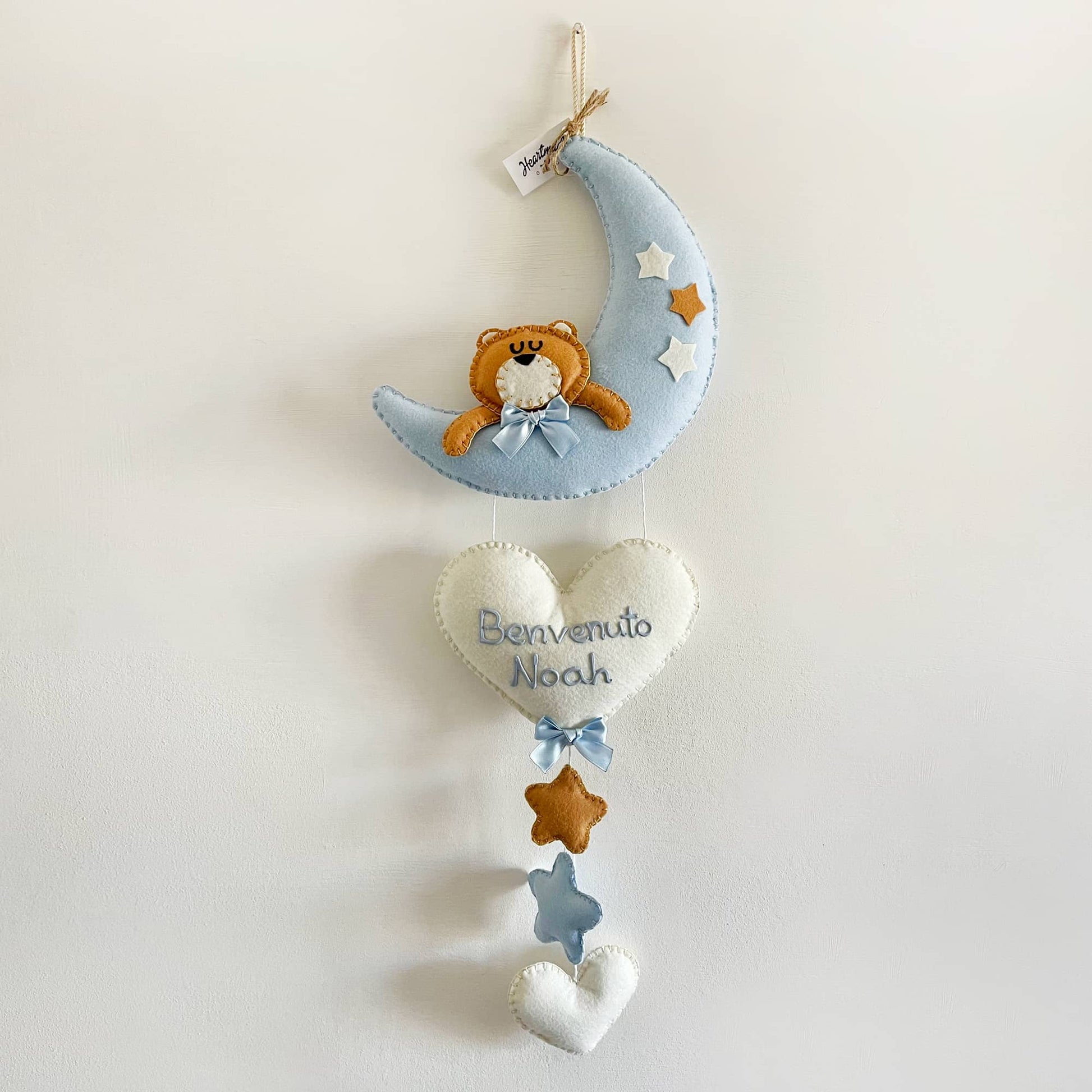 Arriva dalla Luna un tenero Orsetto per annunciare la Nascita di un Bebè. Da utilizzare come fiocco nascita o semplicemente per decorare la cameretta dei piccoli. Abbinalo agli altri articoli nascita per comporre il tuo set personalizzato.