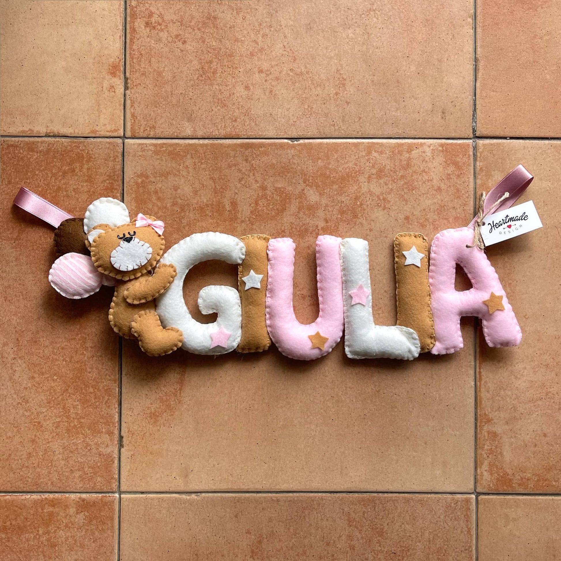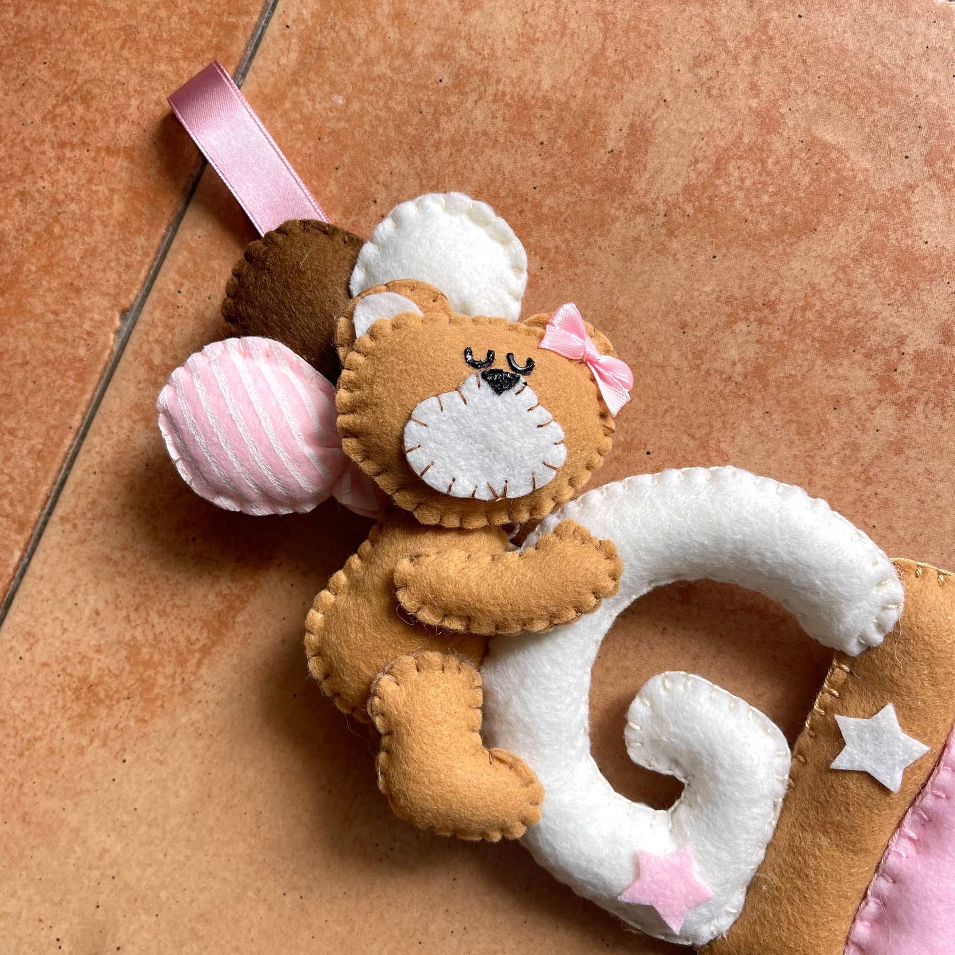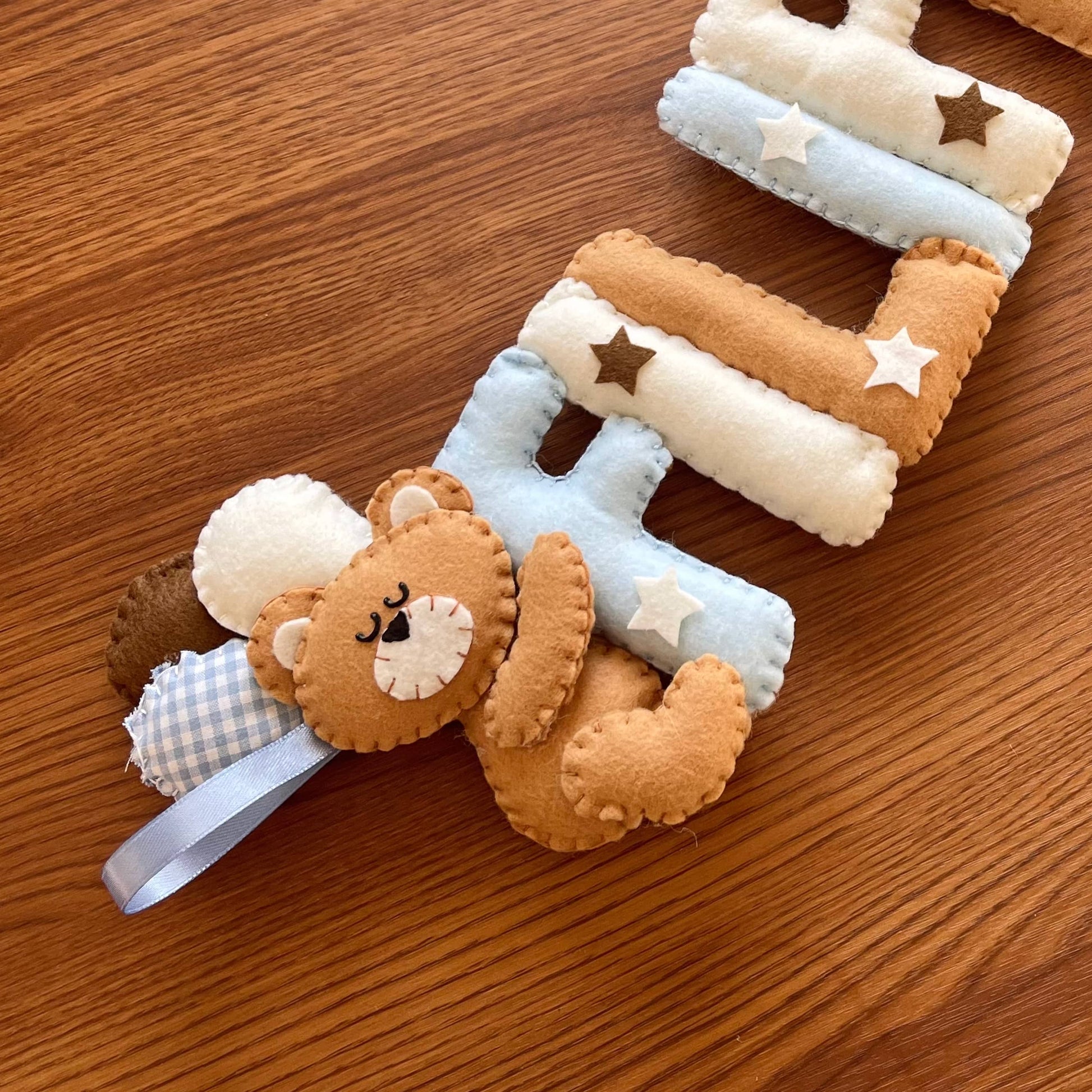 Tenero e morbido nome in stoffa da appendere alla culla, al passeggino o semplicemente per decorare la cameretta dei bimbi. Un'idea regalo originale e interamente handmade. Personalizza il tuo selezionando il numero di lettere e scegliendo la combinazione colori che preferisci. Acquistalo insieme all'orso coi palloni e all'orso su nuvola per realizzare il tuo set.
