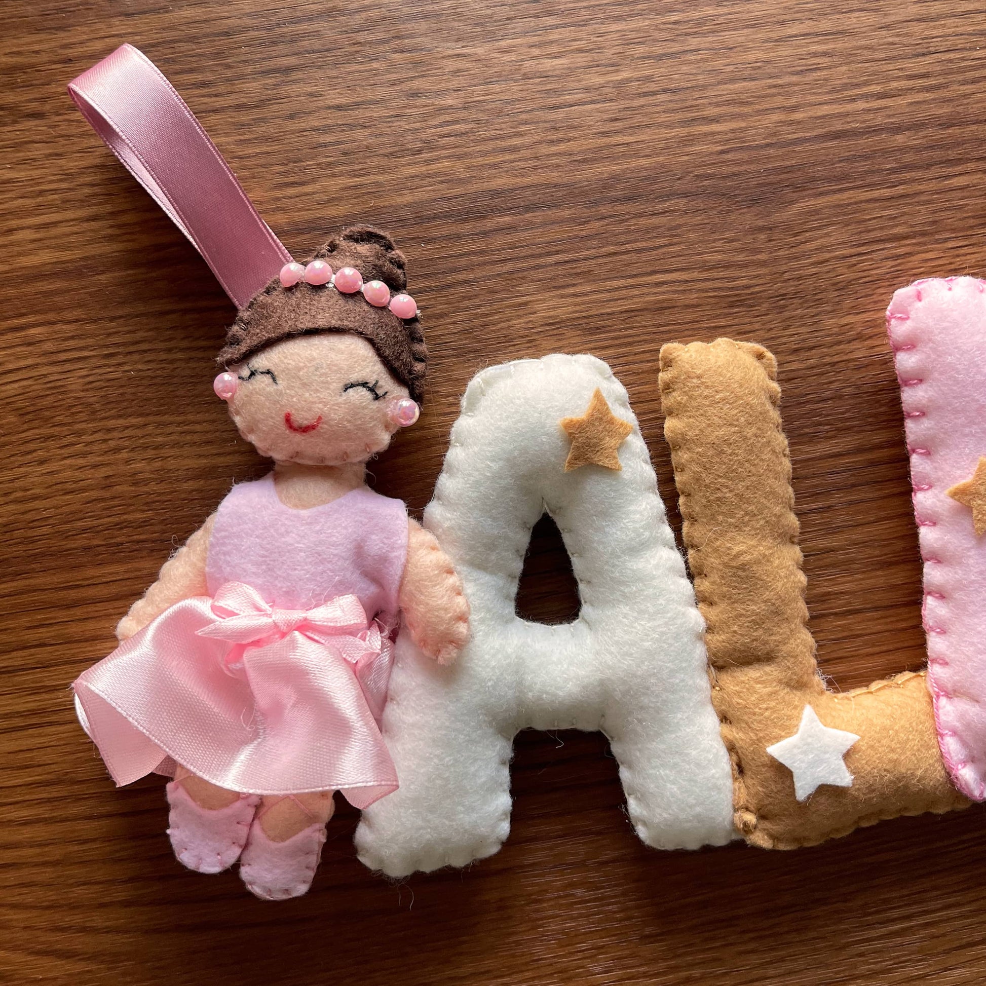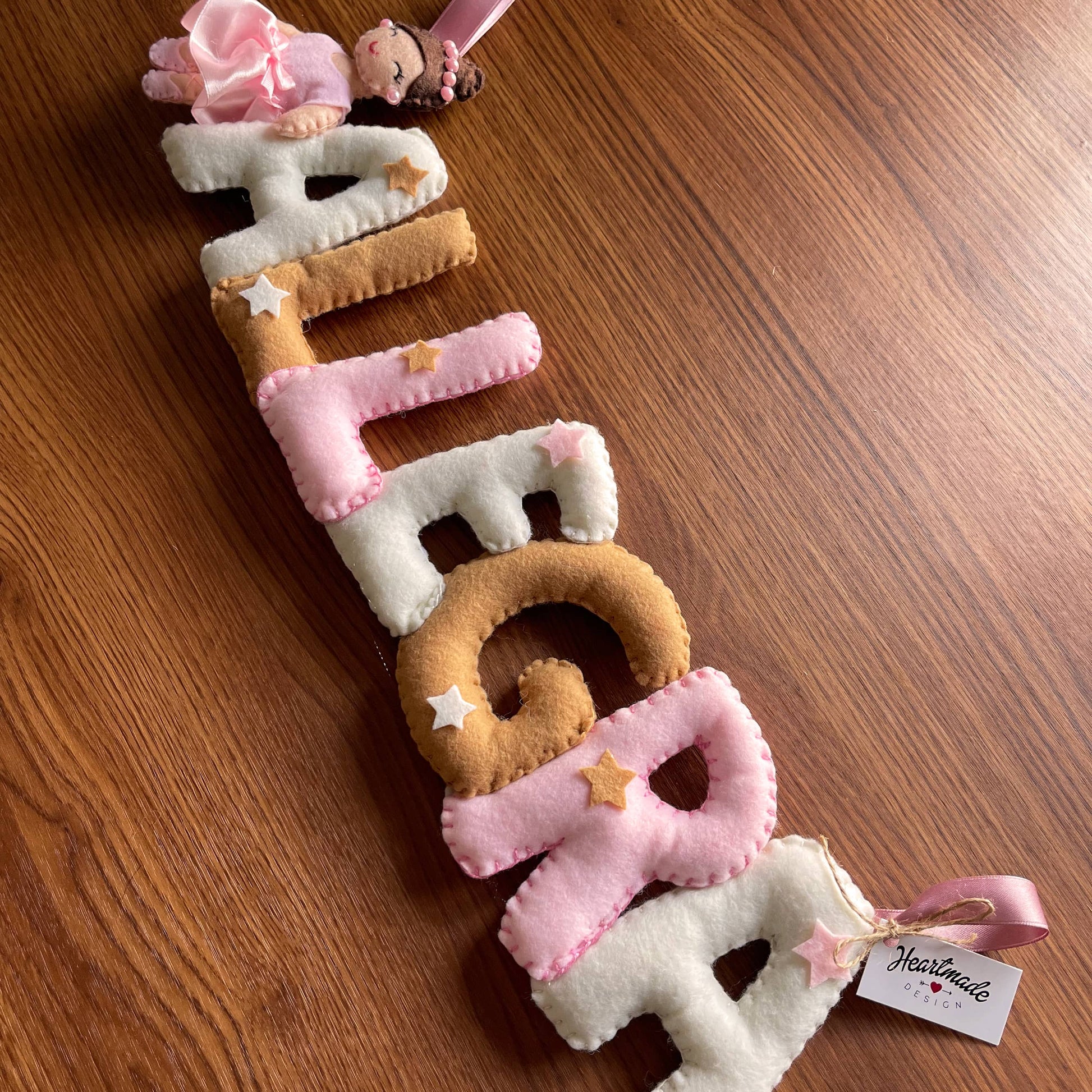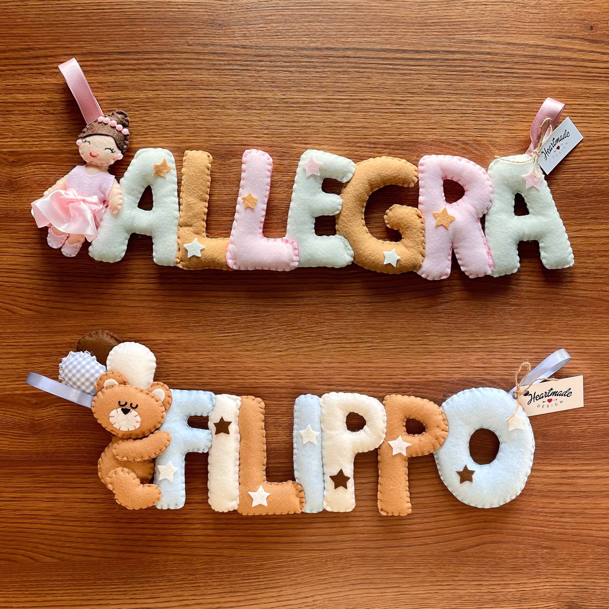 Tenero e morbido nome in stoffa da appendere alla culla, al passeggino o semplicemente per decorare la cameretta dei bimbi. Un'idea regalo originale e interamente handmade. Personalizza il tuo selezionando il numero di lettere e scegliendo la combinazione colori che preferisci. Acquistalo insieme all'orso coi palloni e all'orso su nuvola per realizzare il tuo set.