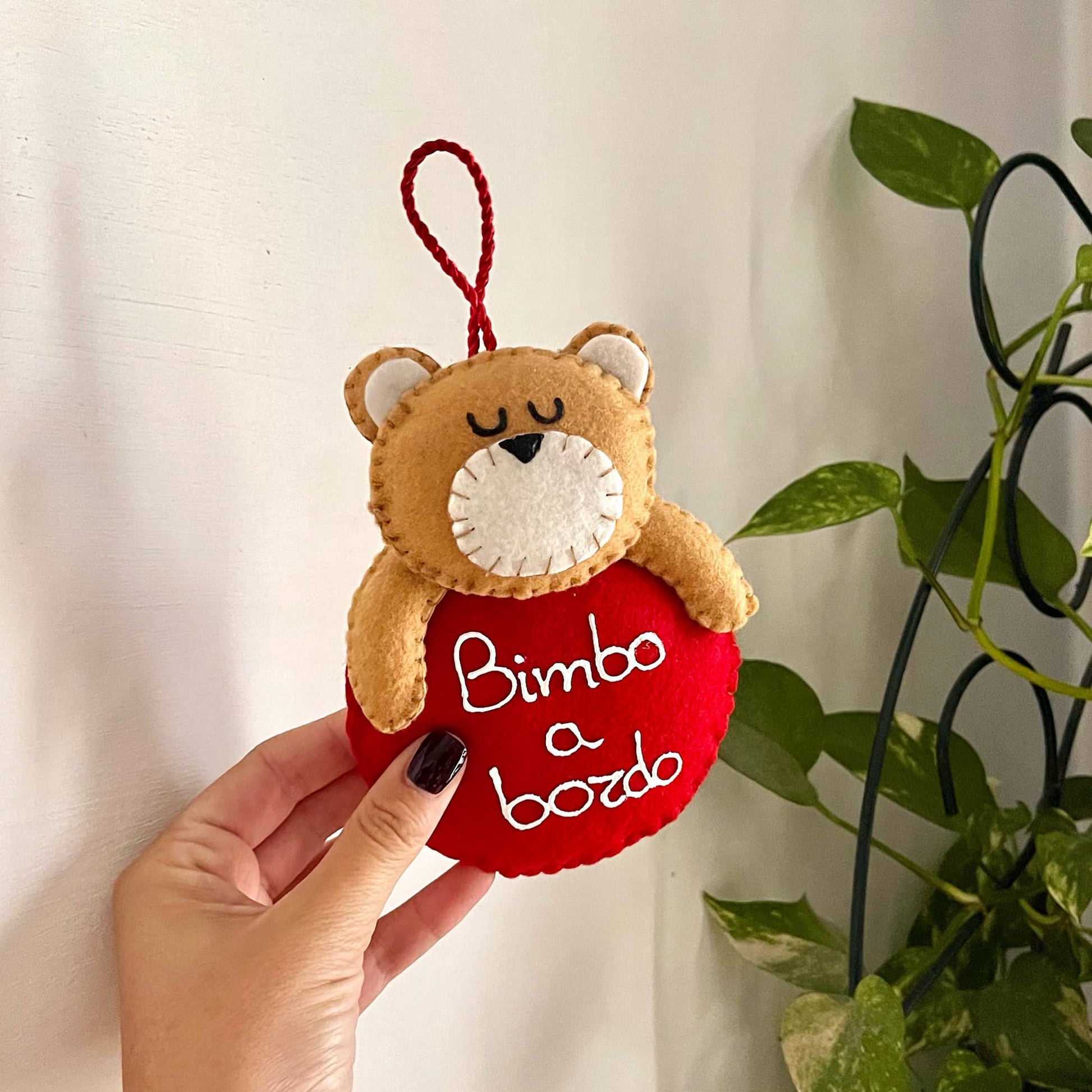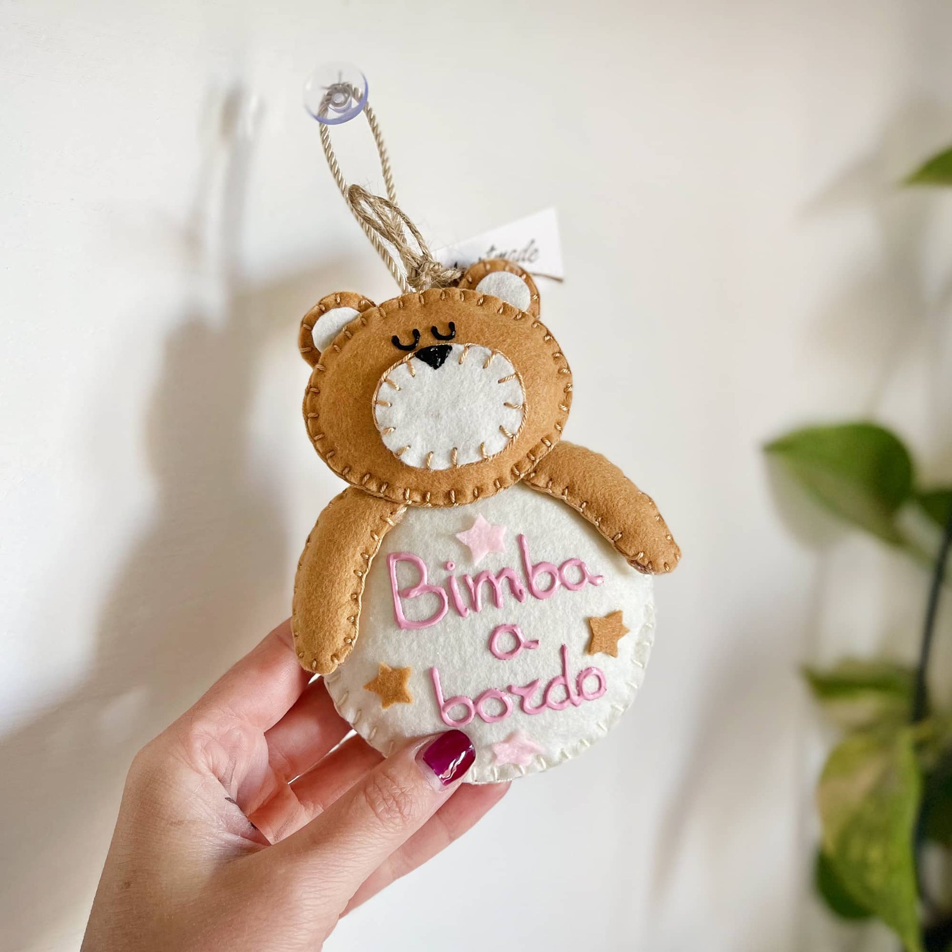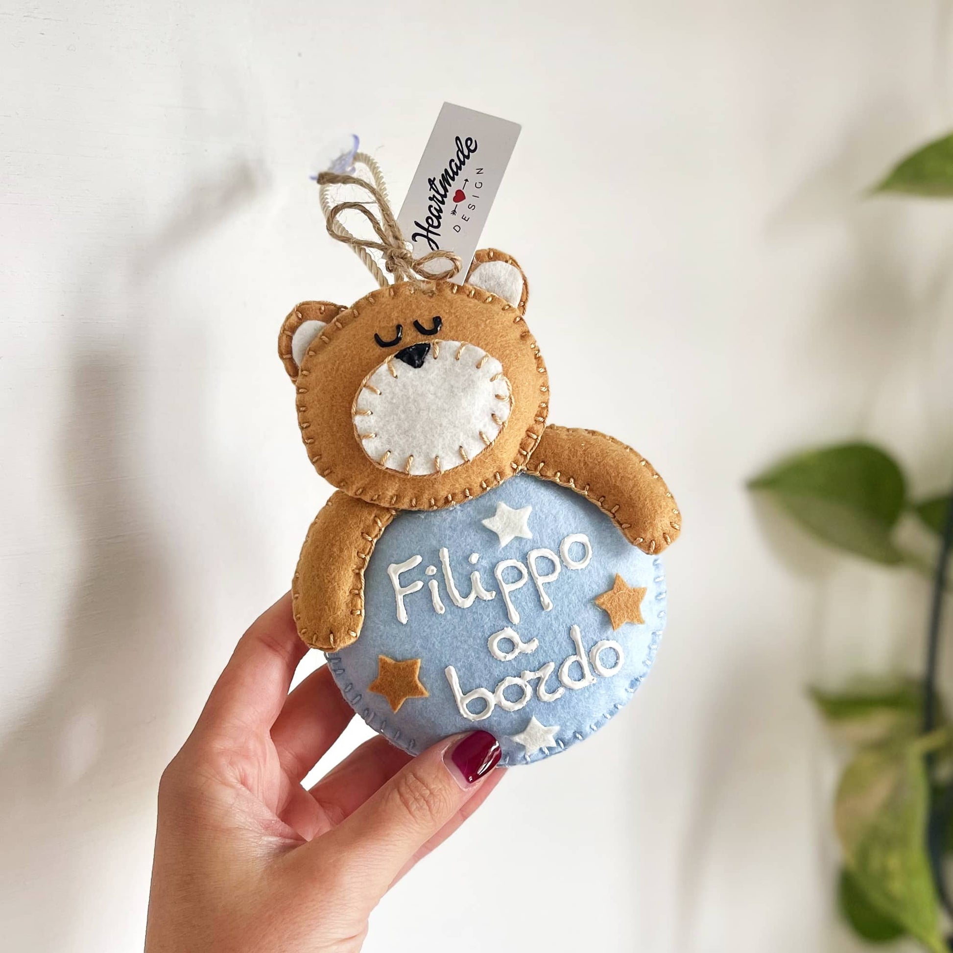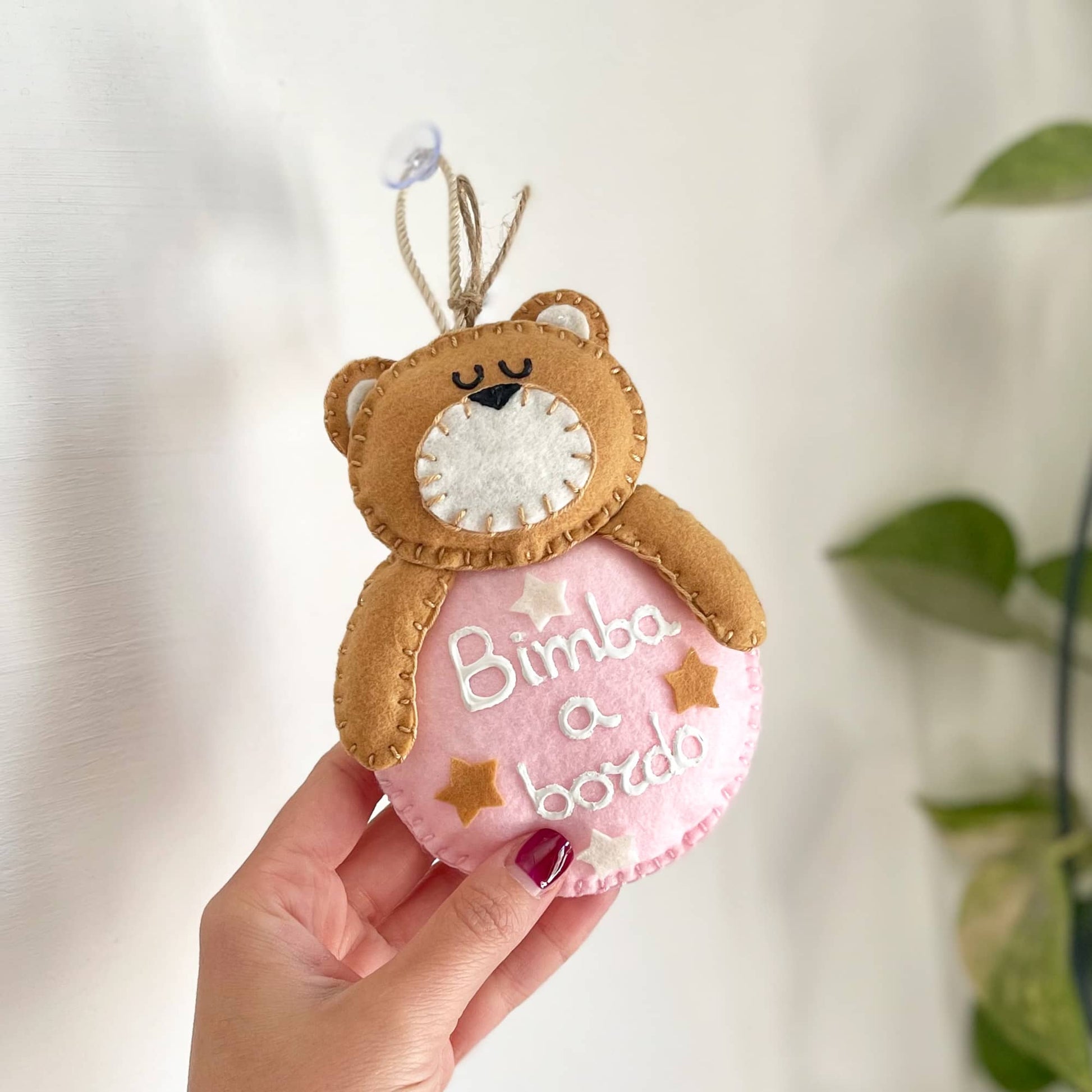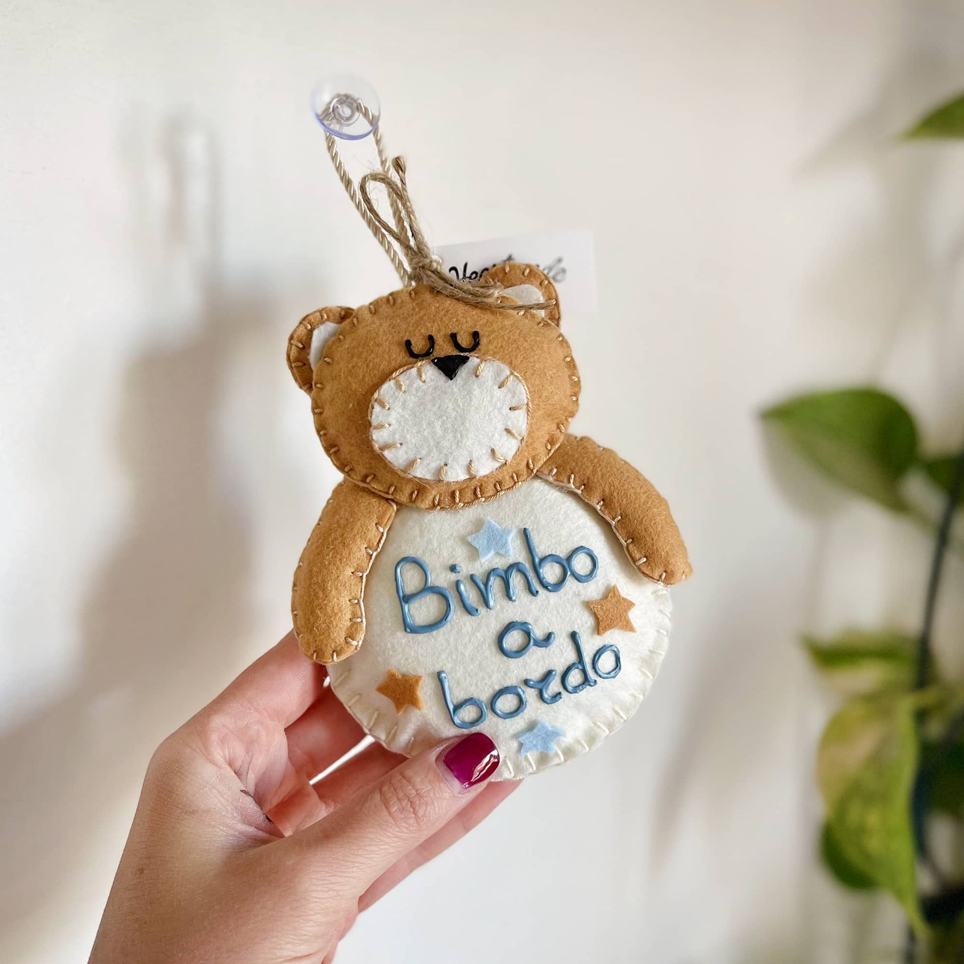 Tenero Orsetto con un messaggio dolce. Da appendere al finestrino per comunicare che c'è un cucciolo a bordo. Scegli il tuo testo. (Ventosa per i vetri fornita da noi). Dimensione: 11x13 cm.