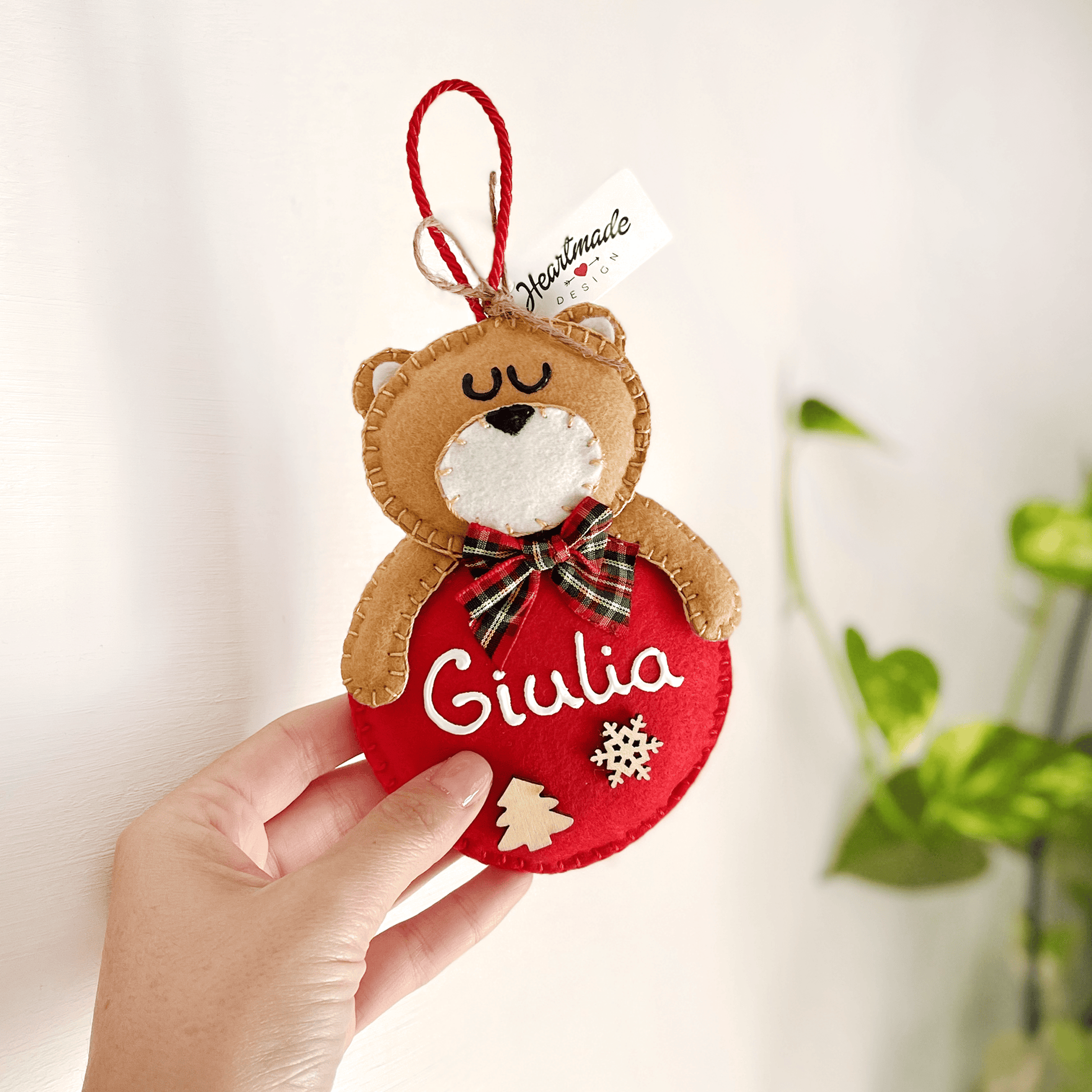 Palla Natalizia con Orsetto Personalizzata. Da appendere come decorazione all'Albero di Natale, in cameretta o su un pacco regalo... per i più piccoli, per il proprio partner o per tutta la famiglia. Scegli il nome e rendi unico il periodo più bello dell'anno! Dimensione: 11x13cm.