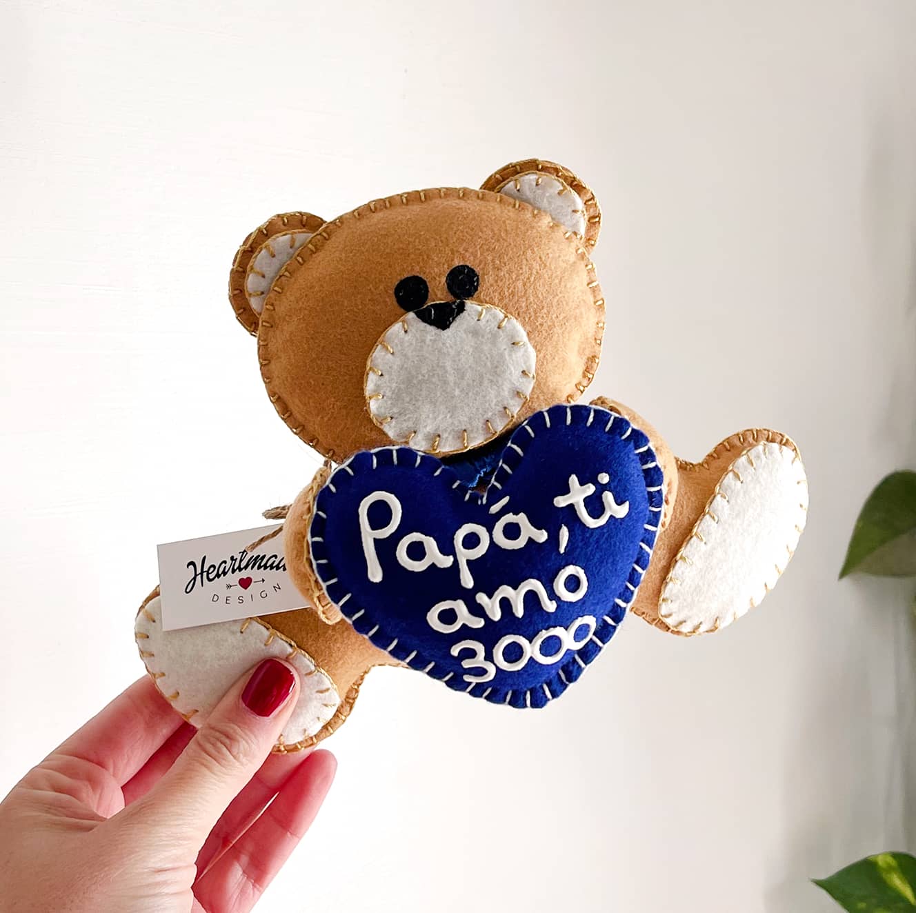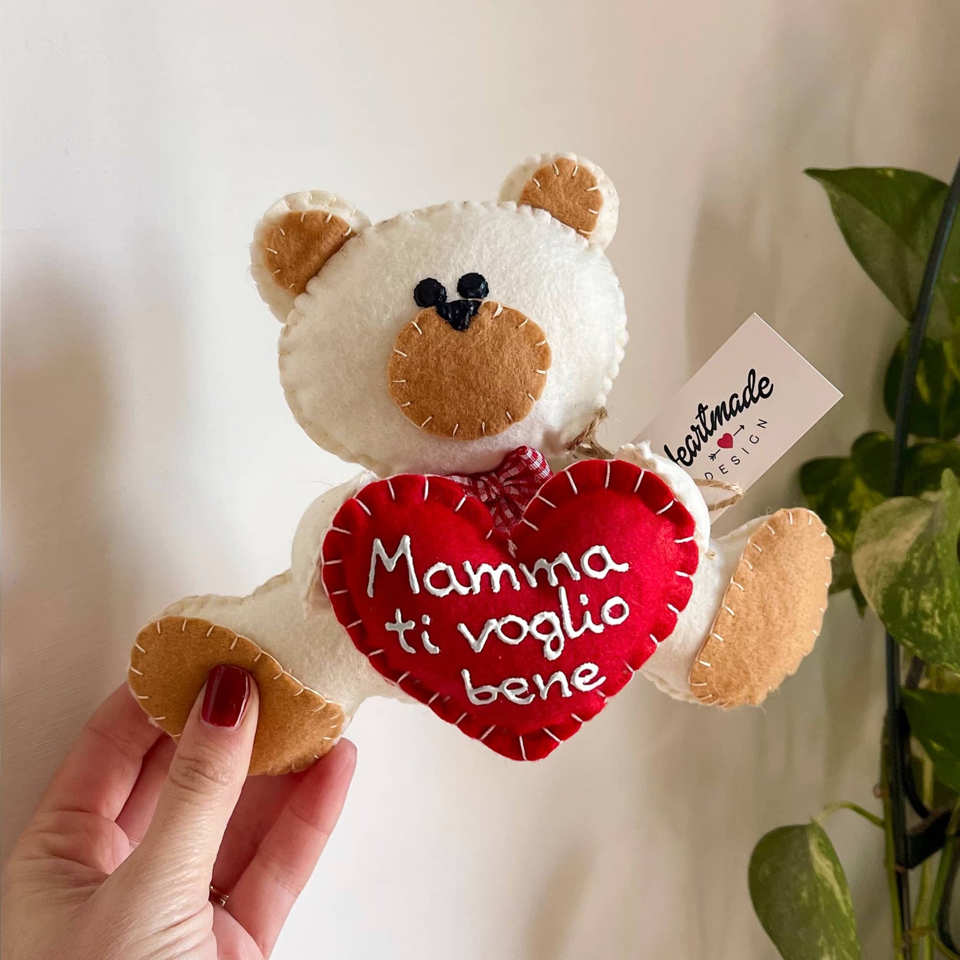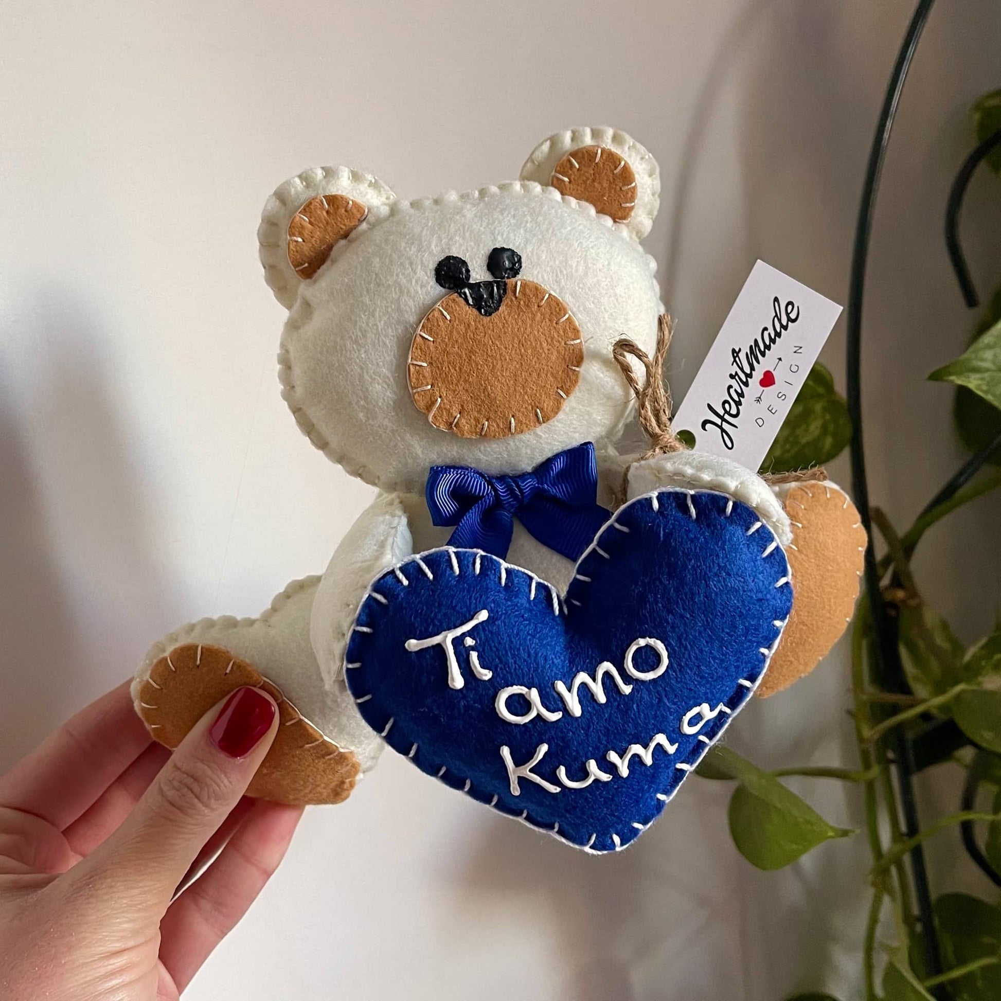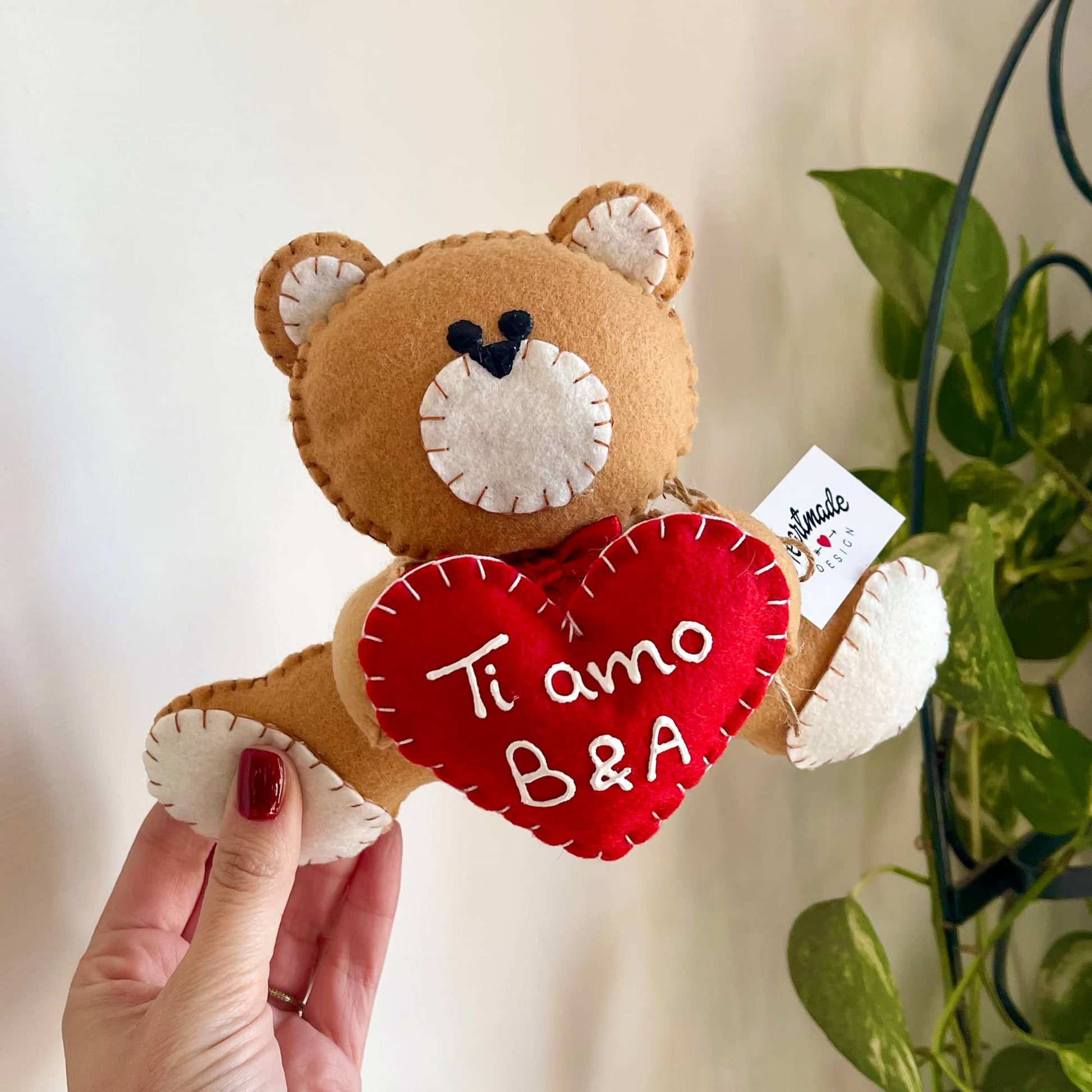 Tenero Orsetto realizzato interamente a mano in pannolenci. Tra le zampe un cuoricino su cui puoi inserire la dedica che preferisci. Scegli i tuoi colori e il tuo messaggio!