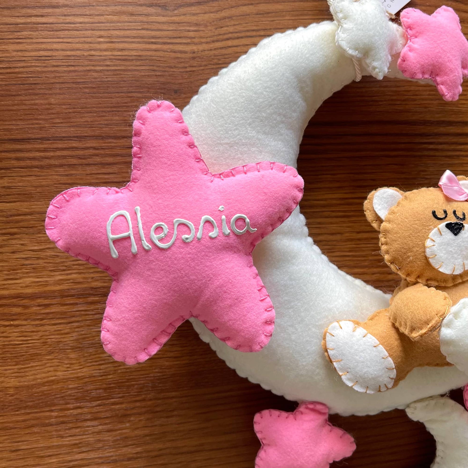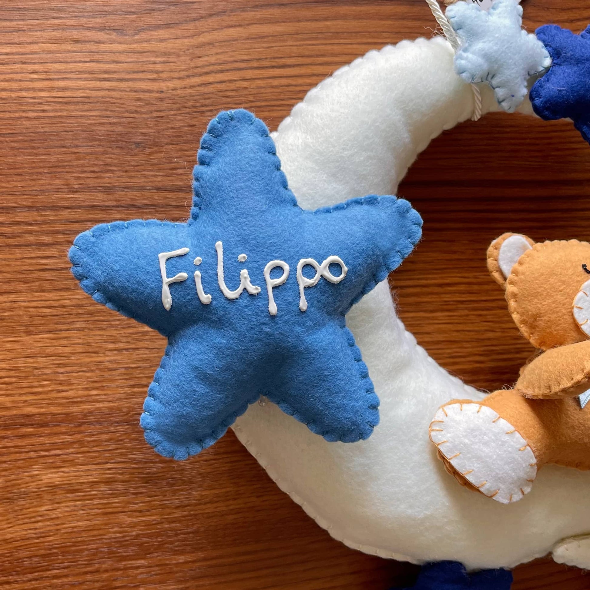 Tenero orsetto seduto su una morbida nuvola circondato di stelline. Da utilizzare come fiocco nascita o semplicemente per decorare la cameretta dei piccoli.