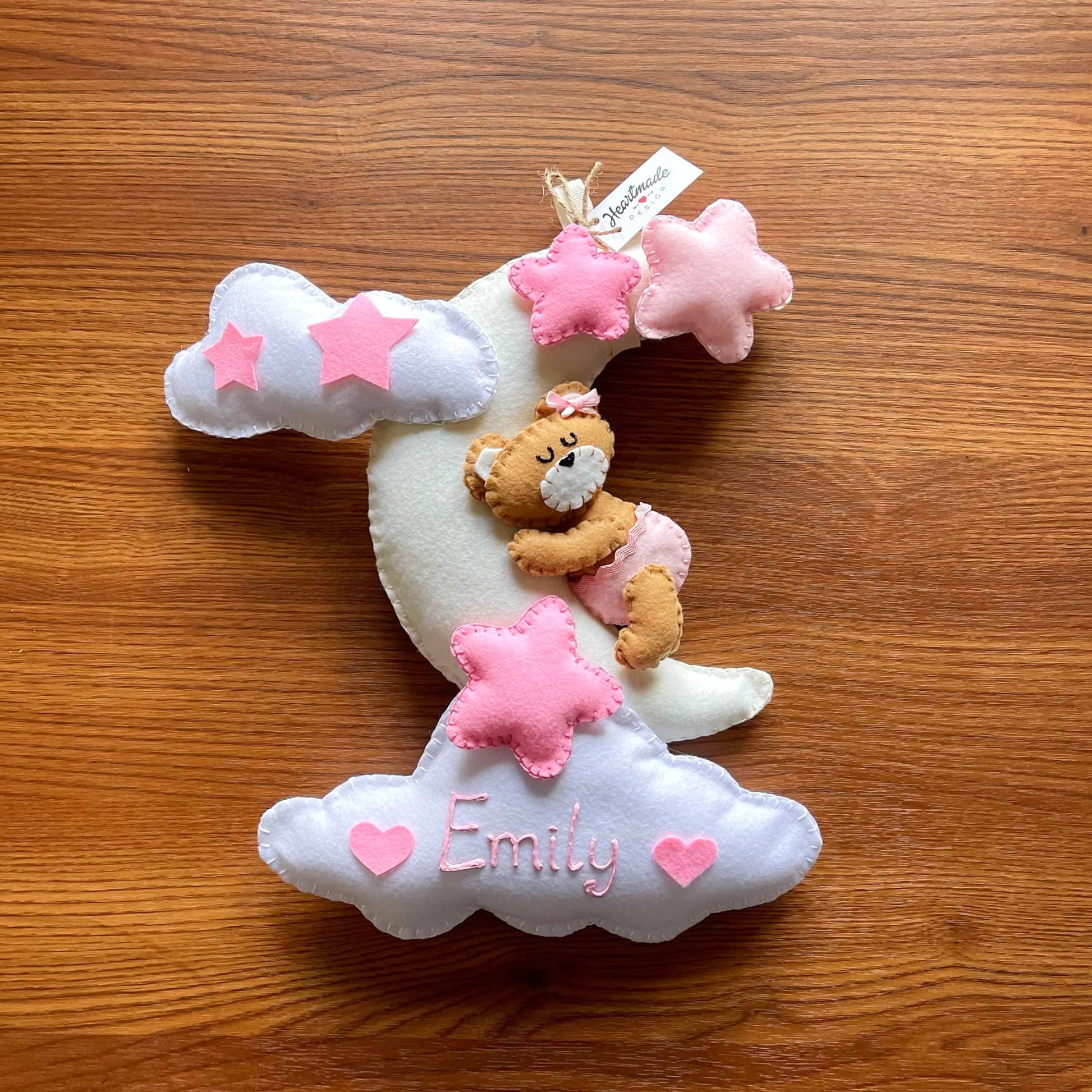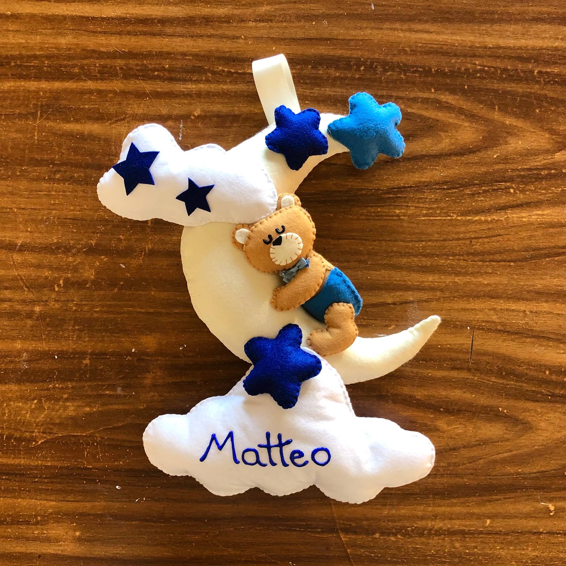 Cosa c'è di più dolce di un tenero orsetto che dorme sulla luna tra le nuvole?! Da utilizzare come fiocco nascita o semplicemente per decorare le camerette dei bimbi. Personalizzalo con il nome del bambino o della bambina. Scegli i tuoi colori.
